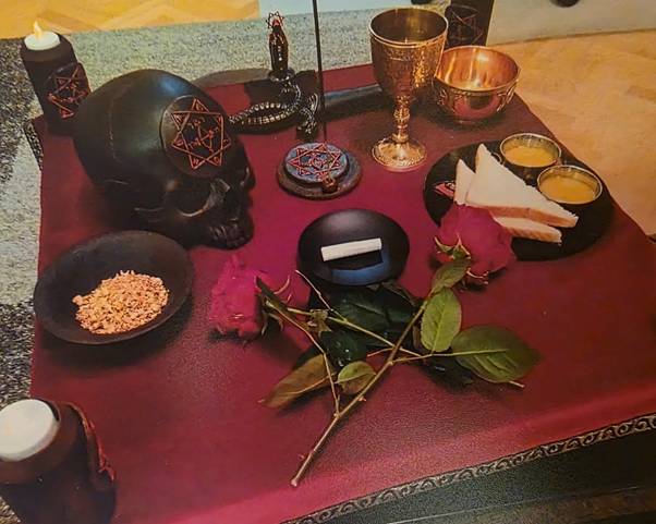 Hier abgebildet eine Darstellung des Tisches und der Kerzen für das Anrufungsritual nach Anweisungen aus dem "Voudon Gnostic Workbook" von Michael Paul Bertiaux: